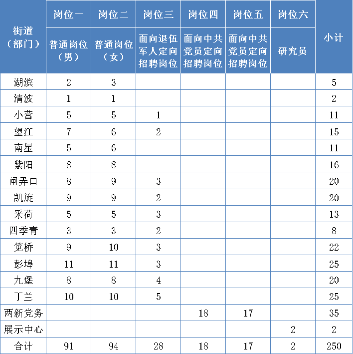 招聘专职社区工作者250名,其中湖滨街道5名,清波街道2名、小营街道11名、望江街道15名、南星街道11名、紫阳街道16名、闸弄口街道20名、凯旋街道20名,采荷街道13名、四季青街道8名、笕桥街道22名、彭埠街道25名、九堡街道20名、丁兰街道25名,专职两新党务工作者35名,杭州中国社区建设展示中心2名。