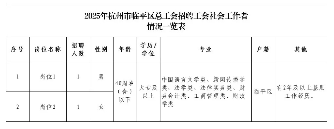 附件:2025年杭州市临平区总工会招聘工会社会工作者情况一览表