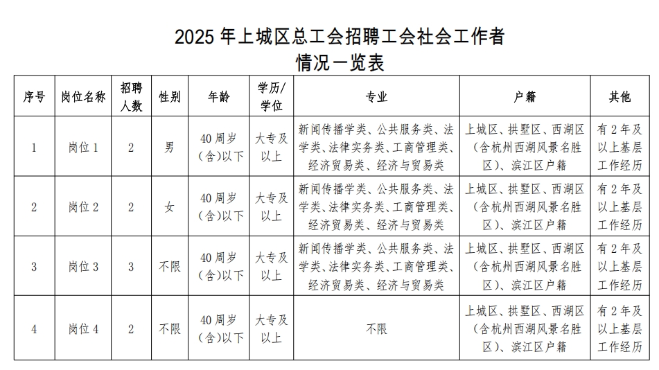 本次招聘共推出4个工会社会工作者岗位,计划招聘工会社会工作者9名。招聘岗位、人数、具体条件及其他情况详见附件《2025年上城区总工会招聘工会社会工作者情况一览表》。