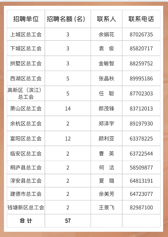 根据工会工作需要,今年我市共招聘社会化职业化工会工作者57名,具体招聘单位和名额如下: