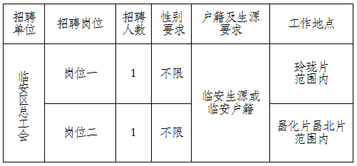 因工作需要,杭州市临安区总工会现面向社会公开招聘社会化职业化工会工作者。根据浙江省总工会《浙江省社会化职业化工会工作者管理办法》、《浙江省社会化职业化工会工作者招聘实施细则》及相关规定,现将有关事项公告如下: