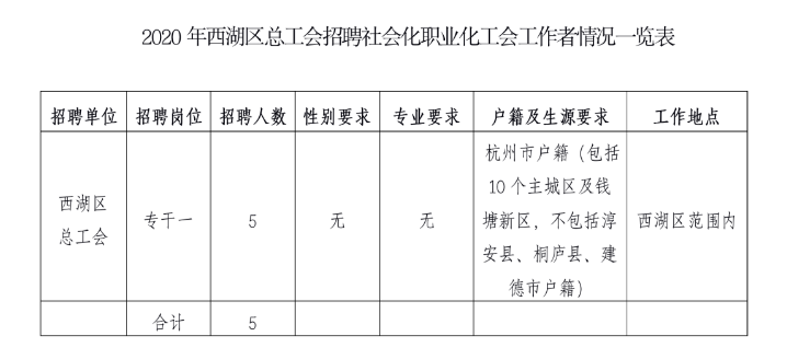 因工作需要,西湖区总工会现面向社会公开招聘社会化职业化工会工作者。根据浙江省总工会《浙江省社会化职业化工会工作者管理办法》、《浙江省社会化职业化工会工作者招聘实施细则》及相关规定,现将有关事项公告如下: