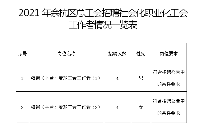 本次招聘专职工会工作者 8名,由余杭区总工会统一调配至相关镇街(平台)工作。各招聘岗位、人数、具体条件及其他情况详见《2021年余杭区总工会招聘社会化职业化工会工作者情况一览表》(附件1)。如岗位报名人数与招聘人数比例不足3:1,则将视情况核减或取消招考岗位。