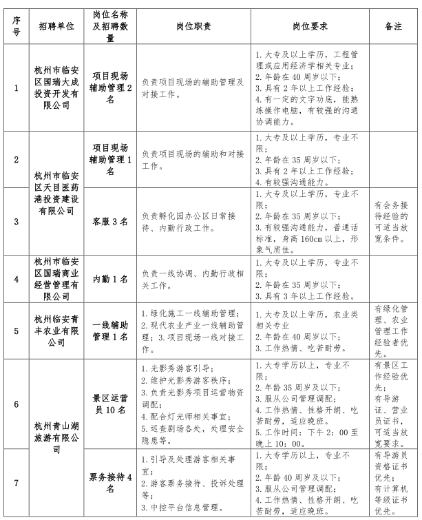 本次计划招聘劳务派遣人员22名。其中,杭州市临安区国瑞大成投资开发有限公司招聘现场项目辅助管理2名;杭州市临安区天目医药港投资建设有限公司招聘项目现场辅助管理1名、客服3名;杭州市临安区国瑞商业经营管理有限公司招聘内勤1名;杭州临安青丰农业有限公司招聘一线辅助管理1名;杭州青山湖旅游有限公司招聘景区运营员10名、票务接待4名。