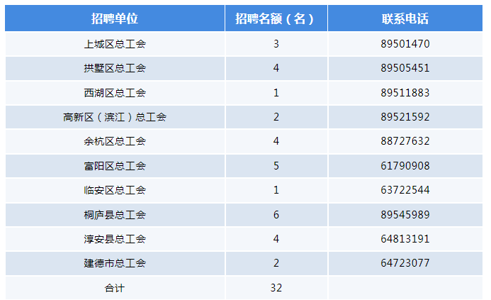 根据工会工作需要,今年我市计划招聘社会化职业化工会工作者32名,具体招聘单位和名额如下: