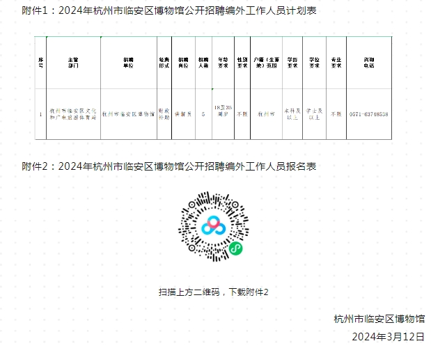 因工作需要,2024年杭州市临安区博物馆将面向社会公开招聘编外工作人员,现将有关事项公告如下: