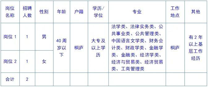 本次招聘共推出2个岗位,计划招聘2名社会化职业化工会工作者,招聘岗位、人数、具体条件及其他情况详见附件《2024年桐庐县总工会招聘社会化职业化工会工作者情况一览表》。