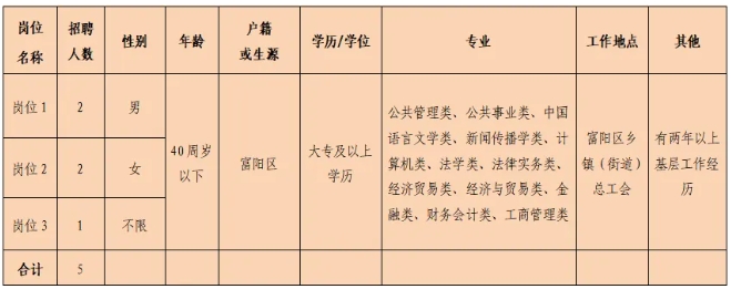 本次招聘共推出3个岗位,计划招聘社会化职业化工会工作者5名。岗位分配原则上同一岗位多个职数的按总成绩从高到低优先选岗。各招聘单位、岗位、人数、具体条件及其他情况详见下表: