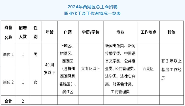 本次招聘共推出2个岗位,计划招聘2名社会化职业化工会工作者。招聘岗位、人数、具体条件及其他情况详见附件《2024年西湖区总工会招聘社会化职业化工会工作者情况一览表》。