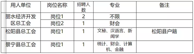丽水全市招聘5名职业化工会工作者,分别为:丽水经济开发区总工会3名,松阳县下属乡镇(街道)总工会1名,景宁县下属乡镇(街道)总工会1名。