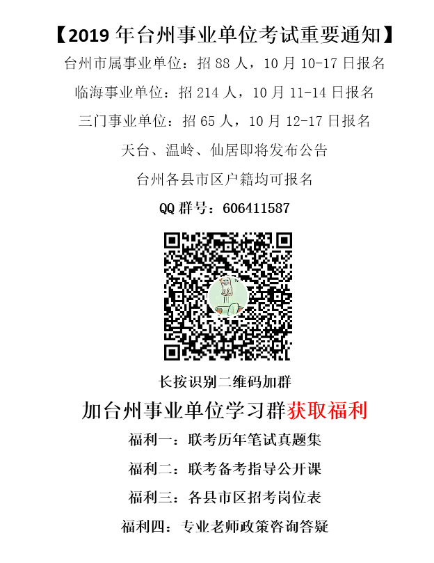 为满足全市各级事业单位补充工作人员的需要,根据台州市委组织部、台州市人力资源和社会保障局《关于进一步加强事业单位公开招聘和人员流动管理的实施意见》(台人社发〔2015〕107号)和《温岭市事业单位公开招聘人员实施办法》(温政发〔2009〕59号)等有关规定,市人力资源和社会保障局将组织实施2019年温岭市事业单位公开招聘工作人员工作。现将有关事项公告如下: