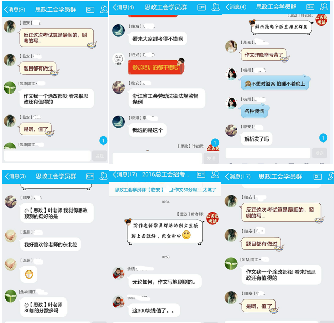 2016年浙江省总工会招聘于11月26日进行全省统考,考试还未结束,就有提前出来的同学在学员群里炸开了锅,客观题90%以上课堂上讲过,而写作题甚至可以直接引用上课资料三篇例文中的一篇。学员们纷纷表示:选择思政教育,选对了!