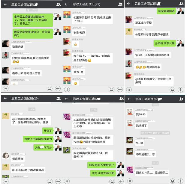 12月10日,金华地区总工会面试,思政面试班三名学员全部录取,其中周俊跃同学以91分的高分成为全场最高分。12月17日,杭州、绍兴、温州地区面试,考试一开始便有学员传来捷报,思政学员在抽到1号签的情况下,面试91.8分,稳稳通过面试。此后,面试喜讯一发不可收拾,不断有学员在群里报喜,也不断刷新着思政学员的面试高分记录。本次浙江省总工会面试班共20名学员,有14名学员成功突围,6个学员面试成绩达到90+,这不是一个人的成功,而是整体的成功,是全体思政师生为期五天日夜奋战的成果。