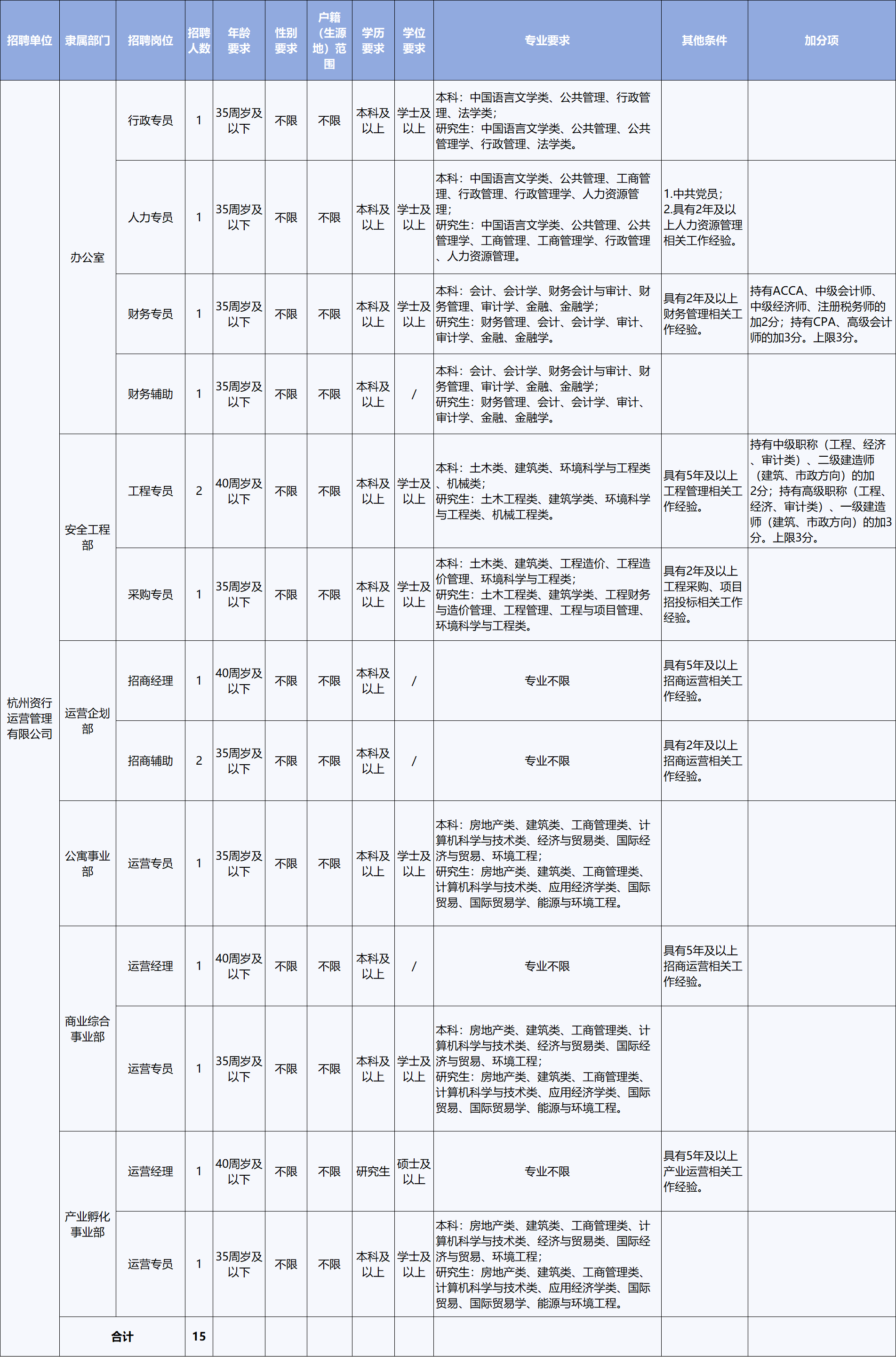 因产业发展需要,集团下属浙江青山湖节能科技有限公司、杭州资行运营管理有限公司面向社会公开招聘工作人员共21名。