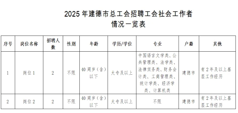 本次招聘共推出2个工会社会工作者岗位,计划招聘工会社会工作者4名。详见附件《2025年建德市总工会招聘工会社会工作者情况一览表》。