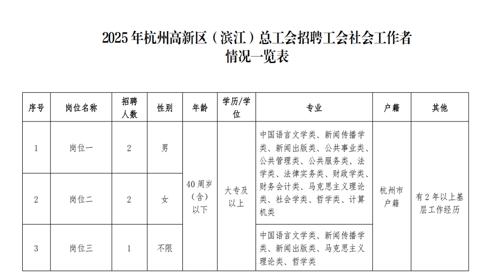 本次招聘共推出3个工会社会工作者岗位,计划招聘工会社会工作者5名。各招聘单位、岗位、人数、具体条件及其他情况详见附件《2025年杭州高新区(滨江)总工会总工会招聘工会社会工作者情况一览表》。
